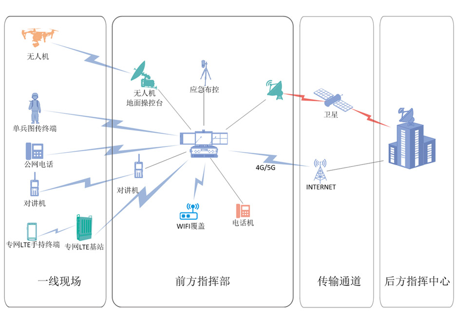 综合采用卫星通信、地面网络和无人机数据传输等技术手段,通过部署便携式现场应急装备,打造天地一体、多域融合、柔韧抗毁、敏捷高效的应急通信网络,建立灾害现场、前方指挥部、后方指挥中心“三位一体”立体指挥体系,有效应对“三无”(无网、无电、无路)极端环境,全面提升现场应急通信保障能力。